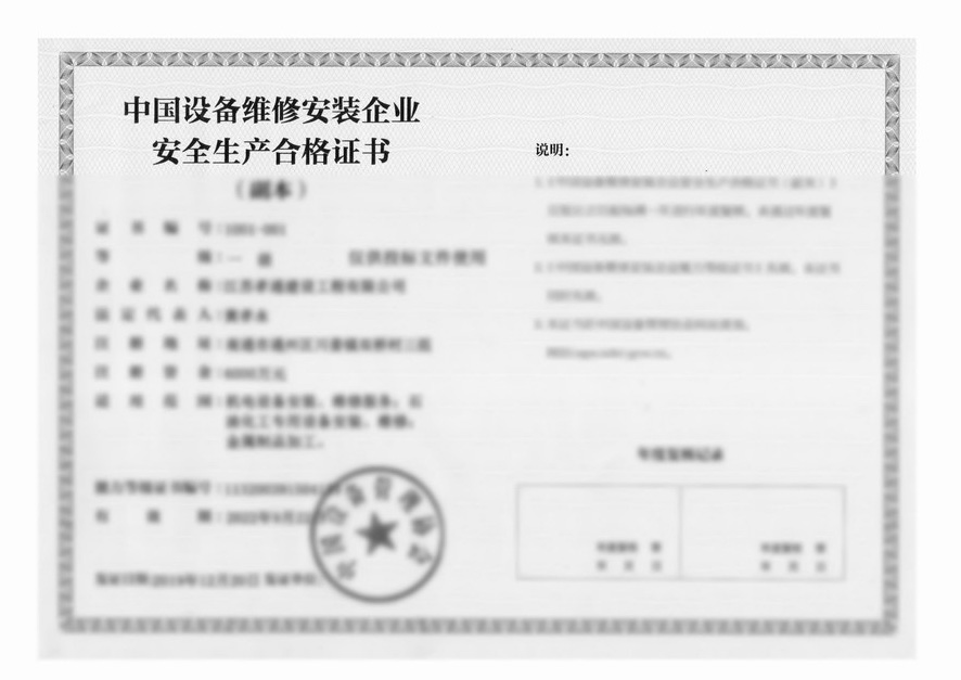 中國(guó)設(shè)備維修安裝企業(yè)安全生產(chǎn)合格證書(shū)